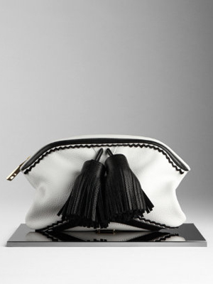 Check out Burberry’s Grainy Luggage Leather Clutch Bag in Black/White, $1350. Available at Burberry.