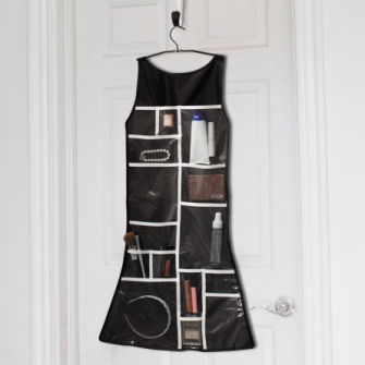 Invest in a cute cosmetic bag that is large enough to hold all your essential products, and lined in vinyl to make for easy cleanups in case your skin toner leaks in your baggage. Another step would be to pick up a cosmetic bag with a hook so when you arrive at your hotel, you can hang it on the door. This one from Umbra is a cute Little Black Dress.
