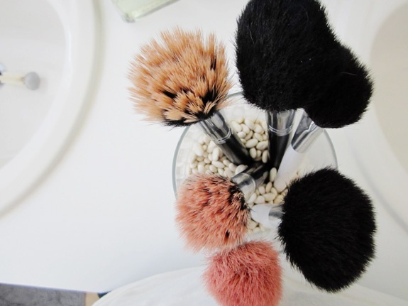 Be nice to your brushes and give them a proper home. An easy and cheap DIY is to pick up a glass vase (even a mason jar will do), fill it with glass beads, stones or even coffee beans and stick the brush handles inside. The stones keep the brushes upright and from falling over, and they will look like pretty flowers on your bathroom counter.