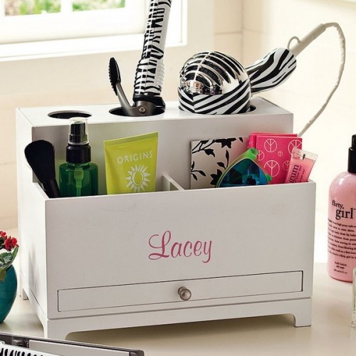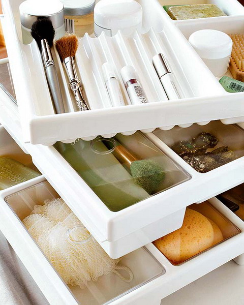 Nothing is more glam and simple than seeing all your products at a glance. Pick up a bunch of clear lucite containers from a home decor or organization store and get sorting. Once you see how pretty your makeup looks in a neat container, it’s easy to keep up the organization.