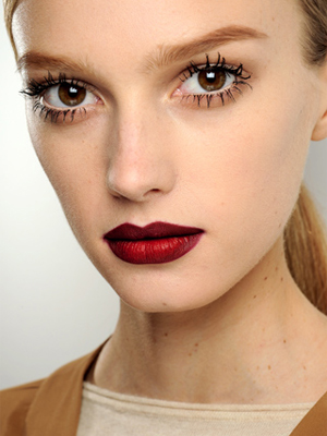 The colour for lips this fall is red. Imagine every shade of red, ranging from deep red, crimson, burgundy, violet, and plum. Dark lips are in on the runway, with deep red a favorite shade. Again neutrals play a part in the fall makeup lineup where the bold deep colours are accompanied by choices of neutral barely there lipsticks in nude, beige and pale pink.
