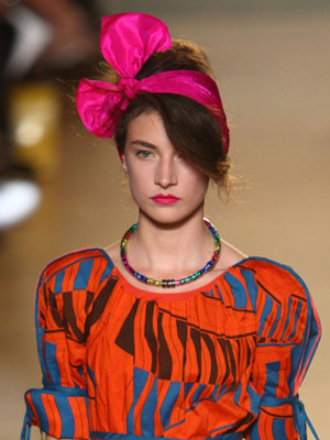 We know that turquoise makeup is a big trend, but the models at DKNY Spring 2010 show wore the colour with a twist: on their lashes. This hue especially works on ladies that have lighter-coloured lashes like blonde, strawberry blonde or light brown. For those with darker lashes, you might find it helpful to first coat lashes in a white primer and then layer a turquoise mascara on top “ the white will help it stand out more. Try this pop of colour with beachy waves or a sleek, high ponytail – just remember to not go overboard with this trend.