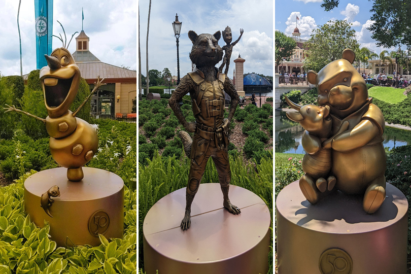 The Disney Fab 50 Character Collection is a series of 36 golden statues depicting 50 different Disney characters that were commissioned for the Walt Disney World 50th Anniversary. You can find these gold statues across the four parks: Magic Kingdom, EPCOT, Animal Kingdom and Hollywood Studios. In 2022, with the debut of MagicBand+, they launched an interactive feature where tapping the new wristbands would cause the statues to play voice and music clips was activated.
