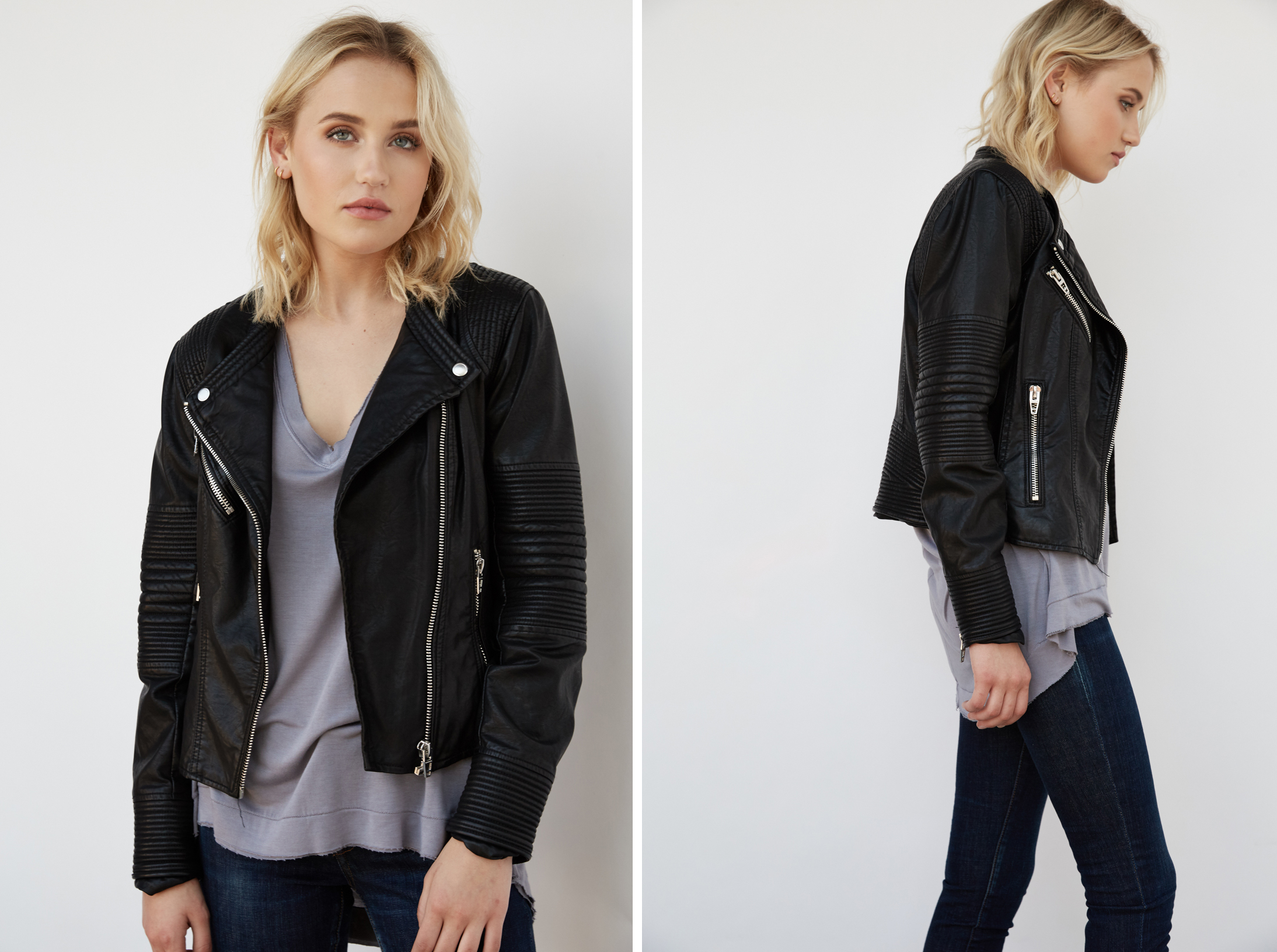 Another brand that is known for vegan leather is BlankNYC and we love their Sleep Swiping Jacket ($128) with its zippered wrists, buckled waist and cropped style. We especially love the quilted sleeves, which will make you look like you just got off the back of a motorcycle, even if you’re actually on your way to grab an almond milk latte.
