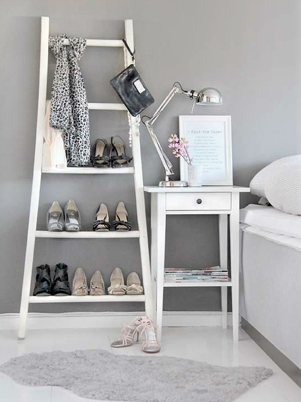 Lean a ladder or a palette: Get creative and repurpose something else from around the house you’re not using. If you can get your hands on a wood palette or an old wooden ladder, you can hook heels on these and call them funky dé©cor at the same time. No need to affix them to anything, either – just lean against the wall.