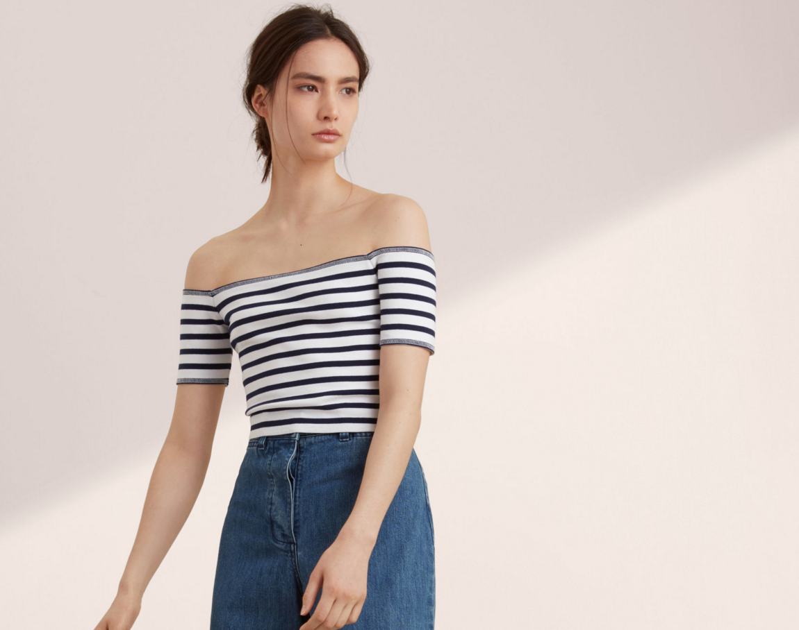 The stripes give this top a different feel than the ultra boho off-the-shoulder pieces we’re used to seeing. Pair with white denim overalls and a red lip and don’t be surprised when you’re mistaken for a famous French starlet.