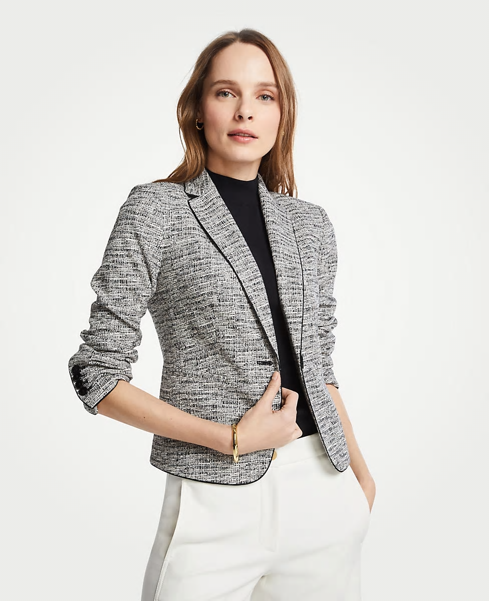 The Newbury Blazer in Marled Knit, $238, from Ann Taylor is versatile, smart, and on-point for those summer meetings. It can be paired with formal pants or jeans, and still gives your look a business-savvy vibe.
