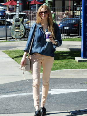 We love that the former star of The City and budding fashion designer Whitney Port reversed roles by pairing her peach pants with a laidback denim top. Nicky Hilton stepped out in a pale pink pair of J Brand jeans, and got wild in a good way with a neutral animal print sweater. Other all-stars in the pastel denim game: Cameron Diaz in a beige tailored blazer, plain white t-shirt and coral denim, Leann Rimes at the airport in the palest green shade, paired with her burgundy McQueen scarf, and the always stunning Rachel Bilson dressing up her lavender legs with a silky top and nude heels at a FOX event.