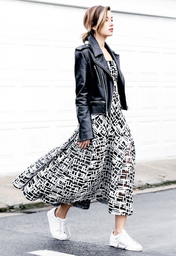 Wondering how to get wear out of your maxi dress after the summer? Easy, throw a leather jacket on top to channel biker babe meets boho chic.