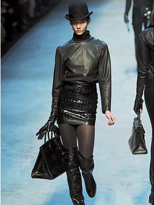 Knee-high boots in leather will be huge for fall. It’s time to move your worn flip-flops to the back of your closet and make some room for chunky heels, pointed toes, and buckles. Fall 2010’s leather boots are full of attitude and promise to make a huge fashion statement when paired with skinny denim or tights.