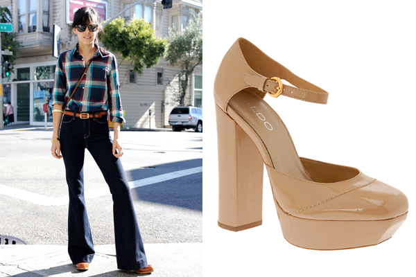 With the 70s aesthetic a must-do for autumn ’11, to prevent pants looking bulky or shapeless, you’ve got to embrace a chunky or a wedge heel style. From the runway (Roberto Cavalli) to the chain store (GAP, H&M), the bell-bottom/heel combo has prevented the post-grunge look of the late 1990s from coming back, as memories of tattered, stepped-on denim are combatted by a well-placed lace-up ankle boot or classic Mary-Jane. (After all, we didn’t say all aspects of the 90s were that great.)