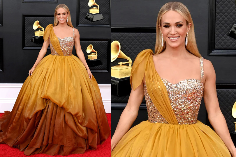 Carrie Underwood wore a dusky yellow Dolce and Gabbana gown with a chic, glittering bodice.