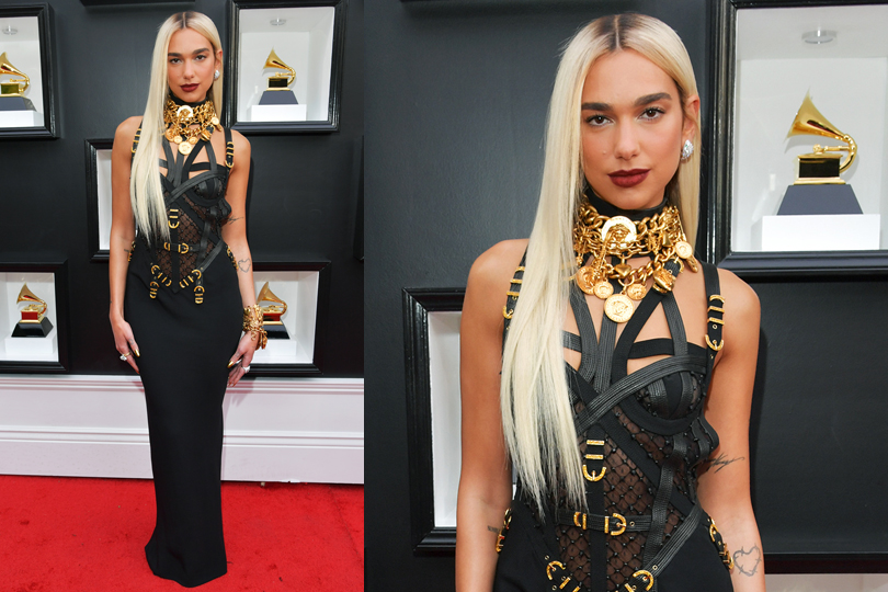 Dua Lipa glowed in a strappy black Versace dress with gold accents on the Grammys red carpet.