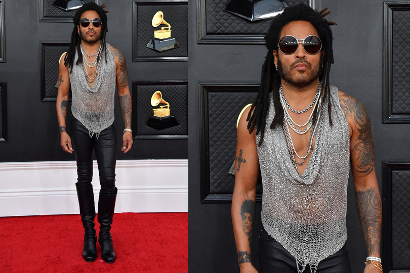 Lenny was a whole vibe as he walked the carpet in a silver chainmail style tank top with leather pants and black knee-high boots with heels.
