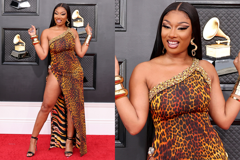 Megan Thee Stallion looked fierce and fiesty in a one-shoulder cheetah print dress.