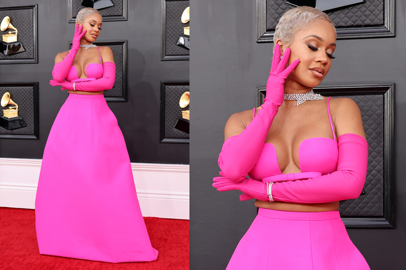 Saweetie sported a custom Valentino two-piece pink ensemble with matching gloves and complemented her look with a silver choker.
