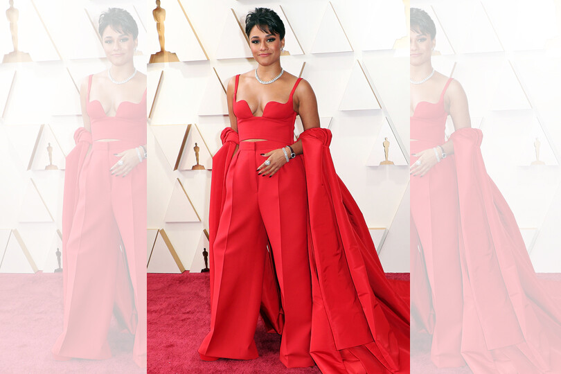 Best Supporting Actress nominee Ariana DeBose rocked a red custom pantsuit by Valentino with plunging bodice, wide-leg pants and voluminous cape. She finished off her look with De Beers diamonds and Omega watch.