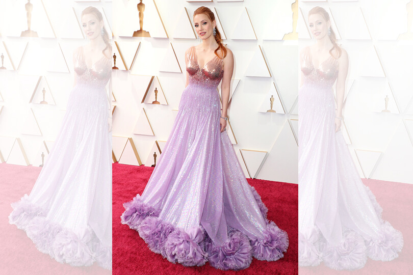 Best Actress nominee Jessica Chastain looked beautiful in an ombré Gucci gown with rose gold bodice fading into a fully sequin lavender skirt with tulle trim. Plus, those chandelier earrings.