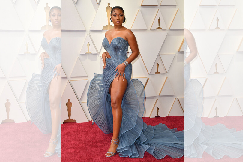 Megan Thee Stallion made her Oscars debut in a crystal-encrusted blue Gaurav Gupta gown with a fitted bodice and dramatic ruffle train. She completed the look with sparkling silver jewels and matching strappy blue heels.