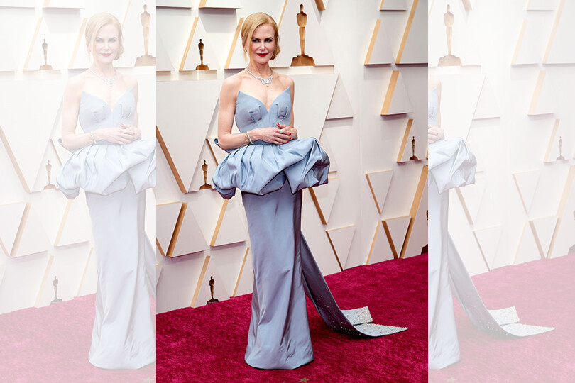Best Actress nominee Nicole Kidman looked stunning in this custom-colored Armani Prive dress that featured petal-style cups and dramatic ruffled detailing around her waist. She accessorized with jaw-dropping jewels and a classic Omega watch.