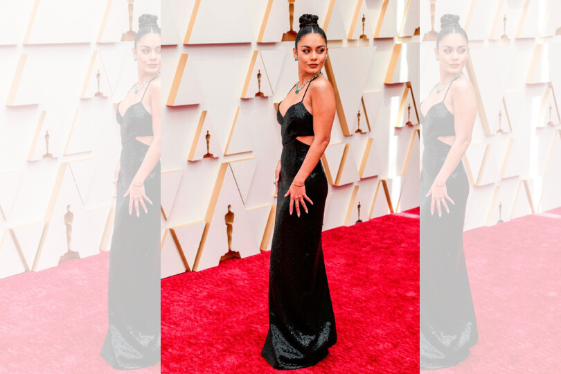 Vanessa Hudgens sparkled in a black Michael Kors gown with daring cut-outs on her waist.
