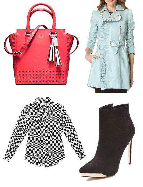 Above: Coach Trapeze bag, Rachel Roy Booties, Joe Fresh Mod Print Shirt, Red Valentino Leather trench