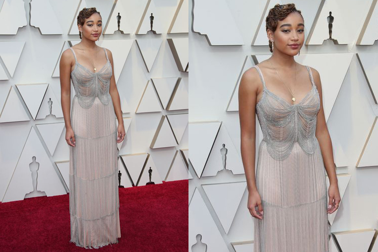 Amandla Stenberg dazzled on the Oscar red carpet wearing this spaghetti strap Miu Miu number with light-catching crystal chains accenting chiffon silk. A flesh-toned, satin clutch and Forevermark Diamonds completed her winning look.