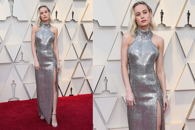 Brie Larson looked gorgeous on the red carpet wearing a sleeveless, high-neck column gown from Celine by Hedi Slimane.