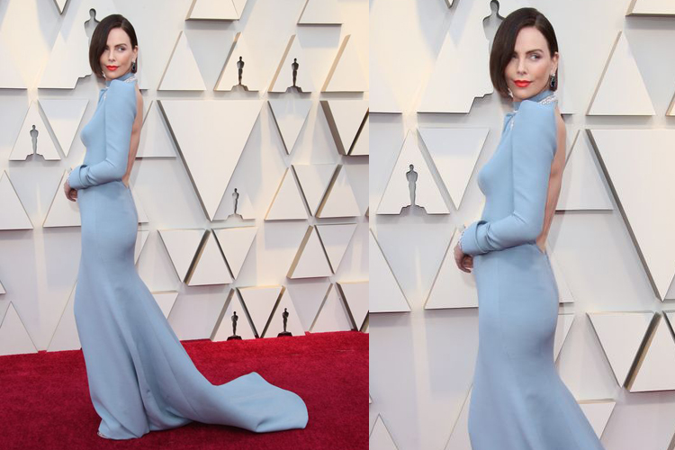 A dark-haired Charlize Theron stunned on the Oscar red carpet wearing a backless, slate blue Dior gown with long sleeves and a pointed shoulder. Theron finished off her look with more than 300 carats of diamonds and almost 20 carats of sapphires from BVLGARI’sSerpenti collection.