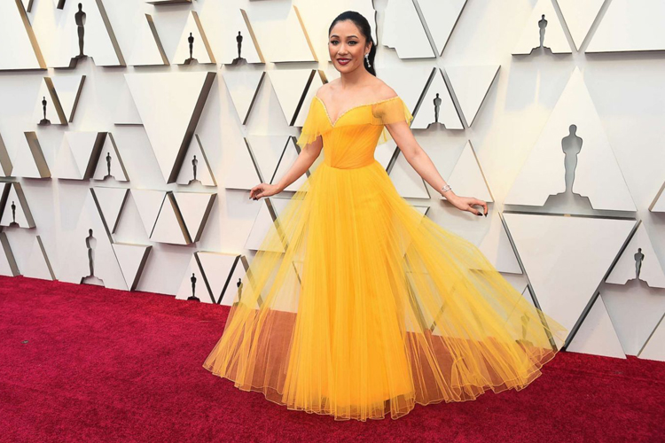 Constance Wu was a Oscar red carpet standout wearing this off-the-shoulder yellow Atelier Versace gown. The custom gown featured epic Swarovski crystal detail at the bodice that screamed Versace glamour!