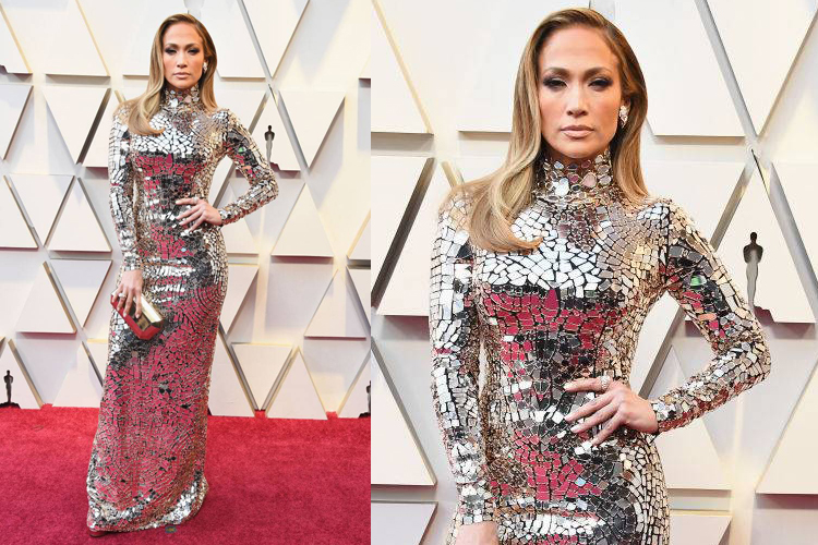 Jennifer Lopez stunned on the Oscar red carpet wearing a floor-sweeping metallic embroidered mirror mosaic long-sleeved gown by Tom Ford. True blinding glamour.