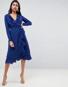 This is a dress that you could easily wear to a wedding, fancy dinner or formal event. Plus, the rich jewel tone and long sleeves make it appropriate for fall and winter weddings, too. 29Secrets Pick: ASOS Ruffle Wrap Midi Dress, $58.33