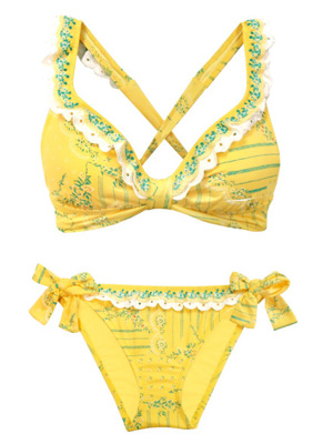 Show off your curves with Betsey Johnson’s Tea Party Ruffle Bikini Top, $108, and Tea Party Standard Tie Bottom in Banana, $90. Available at Betsey Johnson.