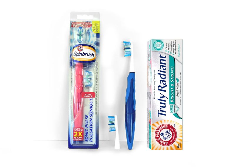 Arm & Hammer Spinbrush Sonic Pulse Battery Tootbrush ($10, available at mass drugstores nationwide) and Arm & Hammer Truly Radiant Bright & Strong Toothpaste ($4, available at mass drugstores nationwide)