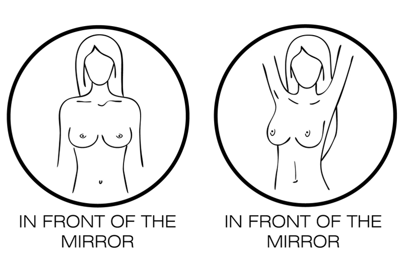 With your arms at your sides, then raised above your head, look carefully for changes in size, shape, and contour of each breast. Look for puckering, dimpling, or changes in skin texture.