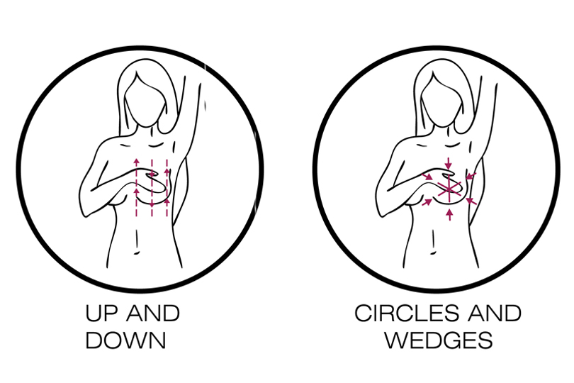 Finger flat, press gently in small circles, staring at the outermost top edge of your right breast and spiralling in toward the nipple. Examine every part of the breast. Repeat with the left breast.
